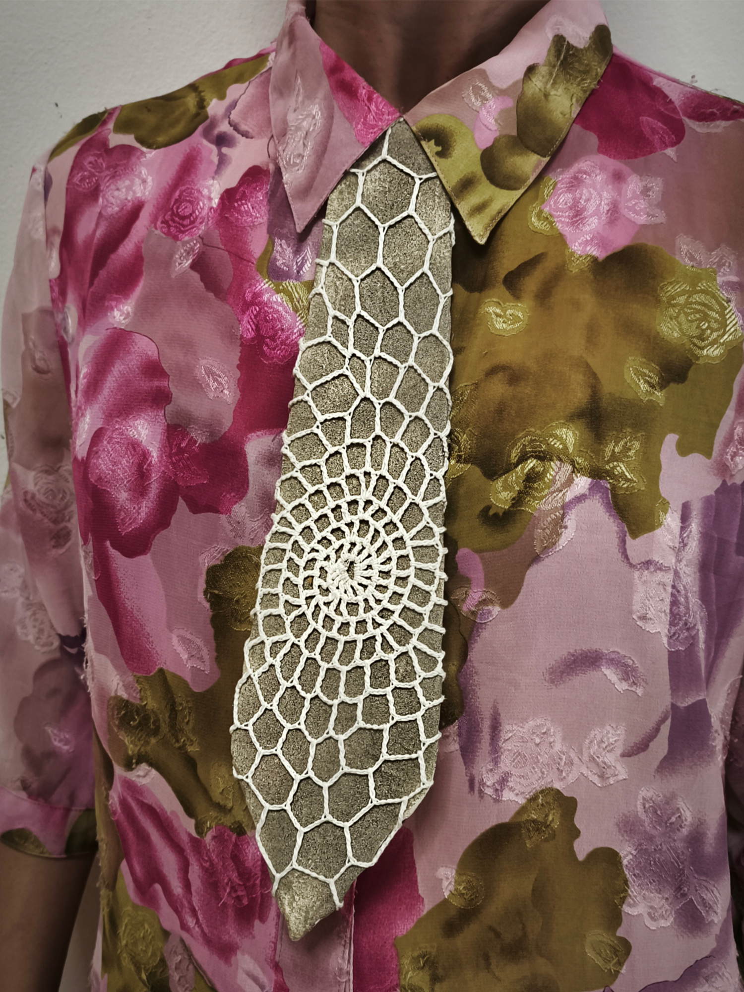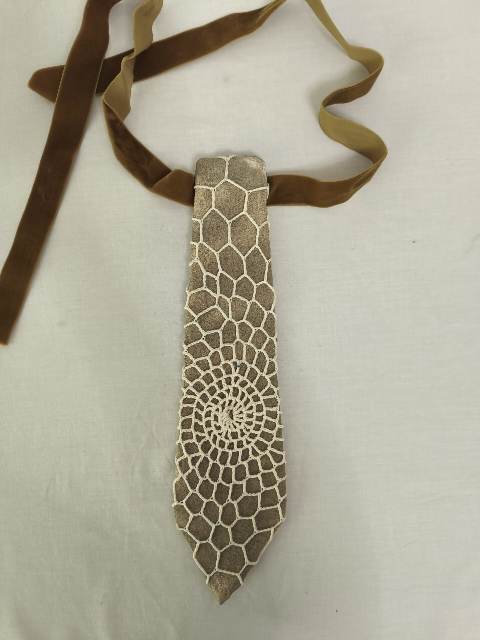 All wearable sculptures, including these one-of-a-kind ties, are handmade in our studio. They are created using building materials, objets trouvés, remnants from various projects, broken domestic items, things from other lives that no longer serve a purpose, and objects found in the streets or forgotten drawers. Each component is meticulously examined and manipulated in a way that highlights the material itself, aiming to find merit in the synthesis of elements, in what becomes a unique peculiarity in the form of a tie.