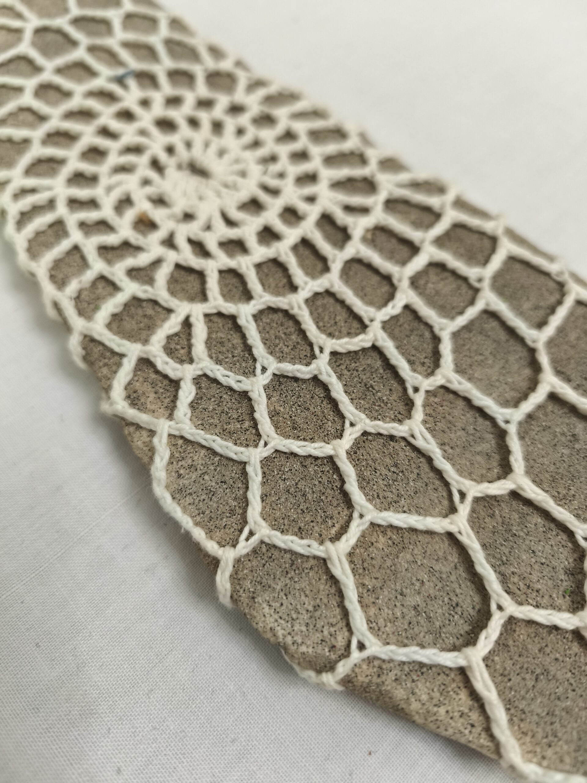 stone-textured tie with wonderful handcrocheted doily  / secured with pistachio green velvet tie