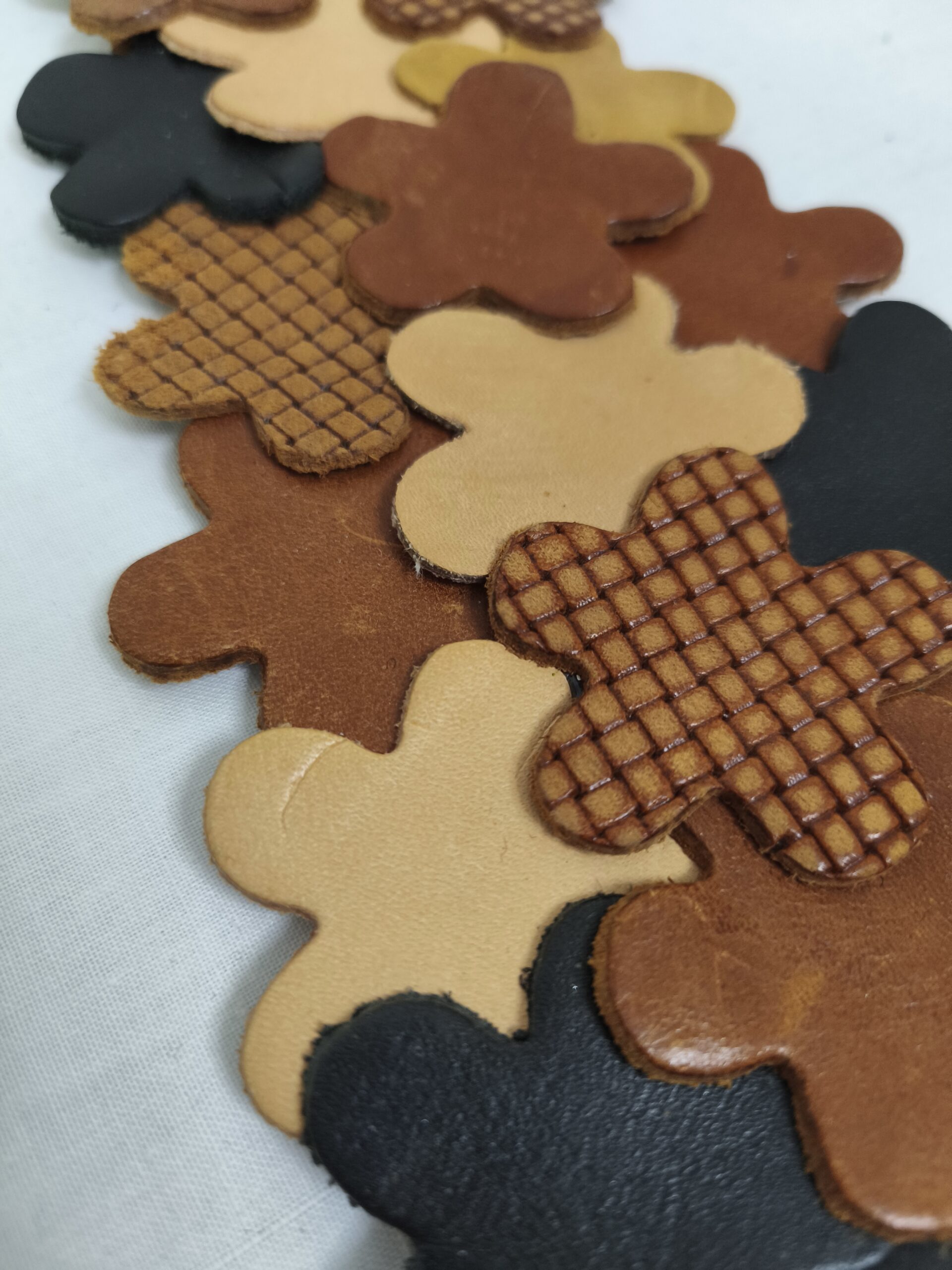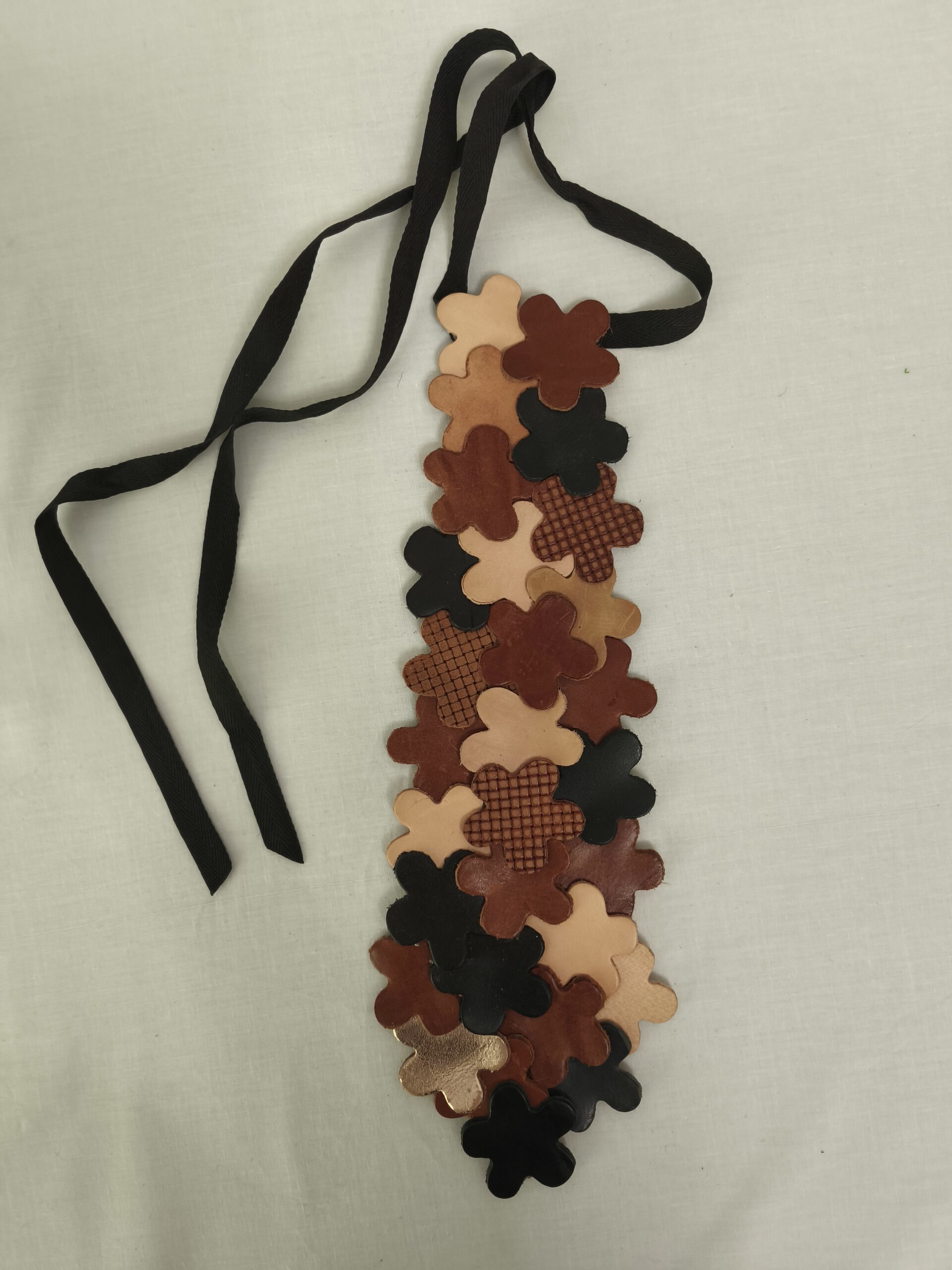 multitoned tan leather scraps from a hand-bag factory in Thessaly   / secured with black cotton ribbon