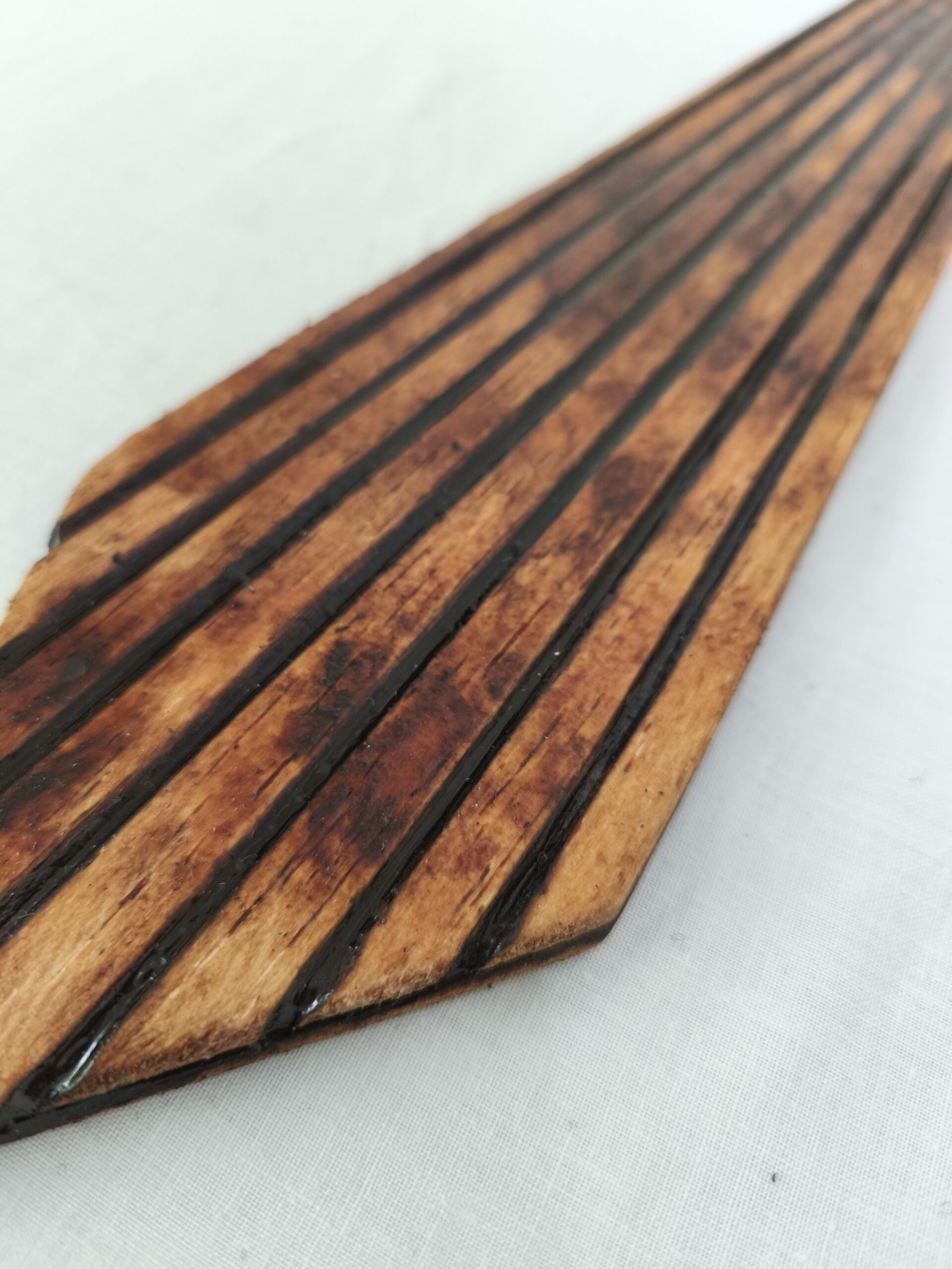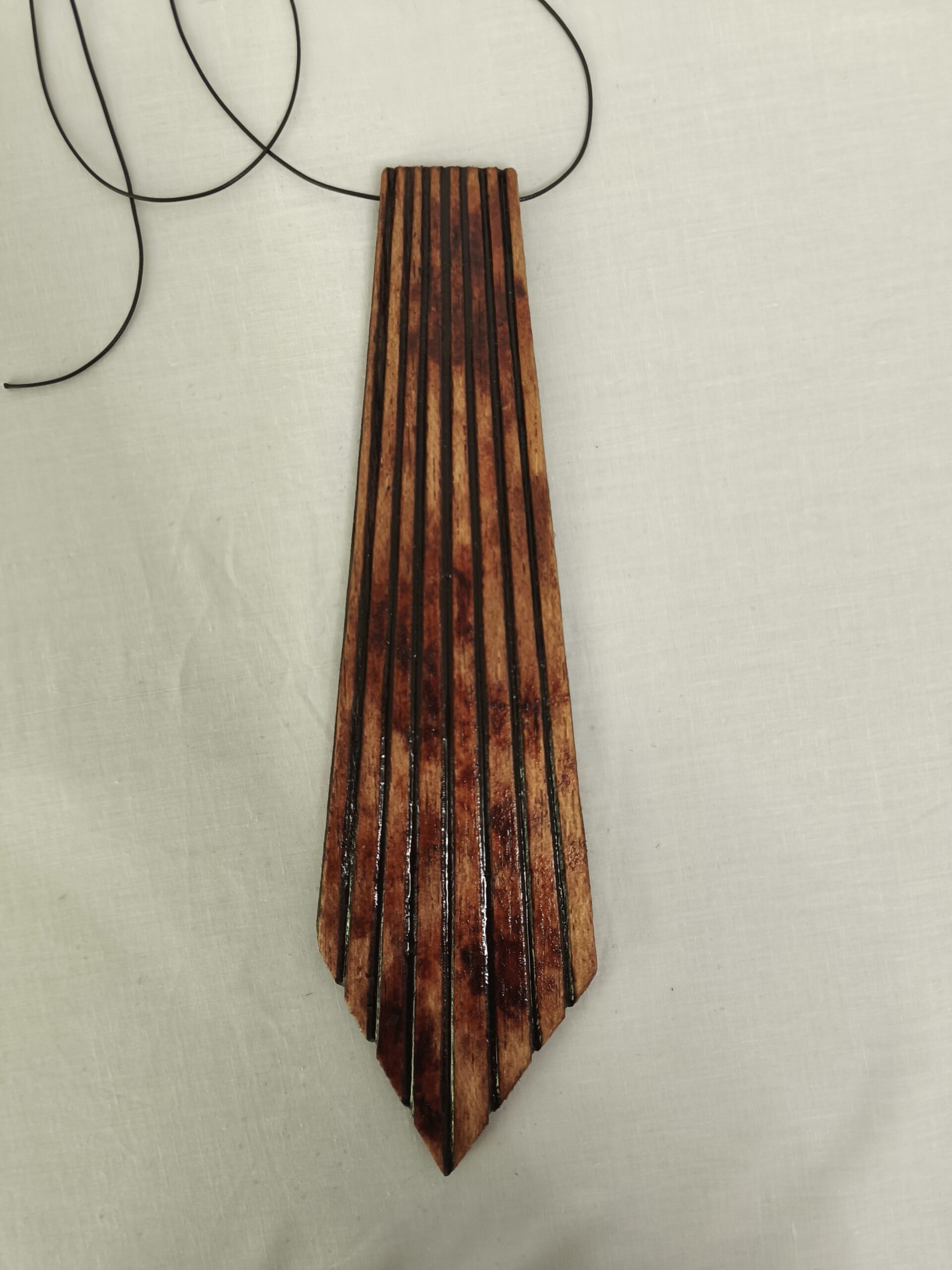 sculpted balsa and varnished with a wooden finish / secured with black string