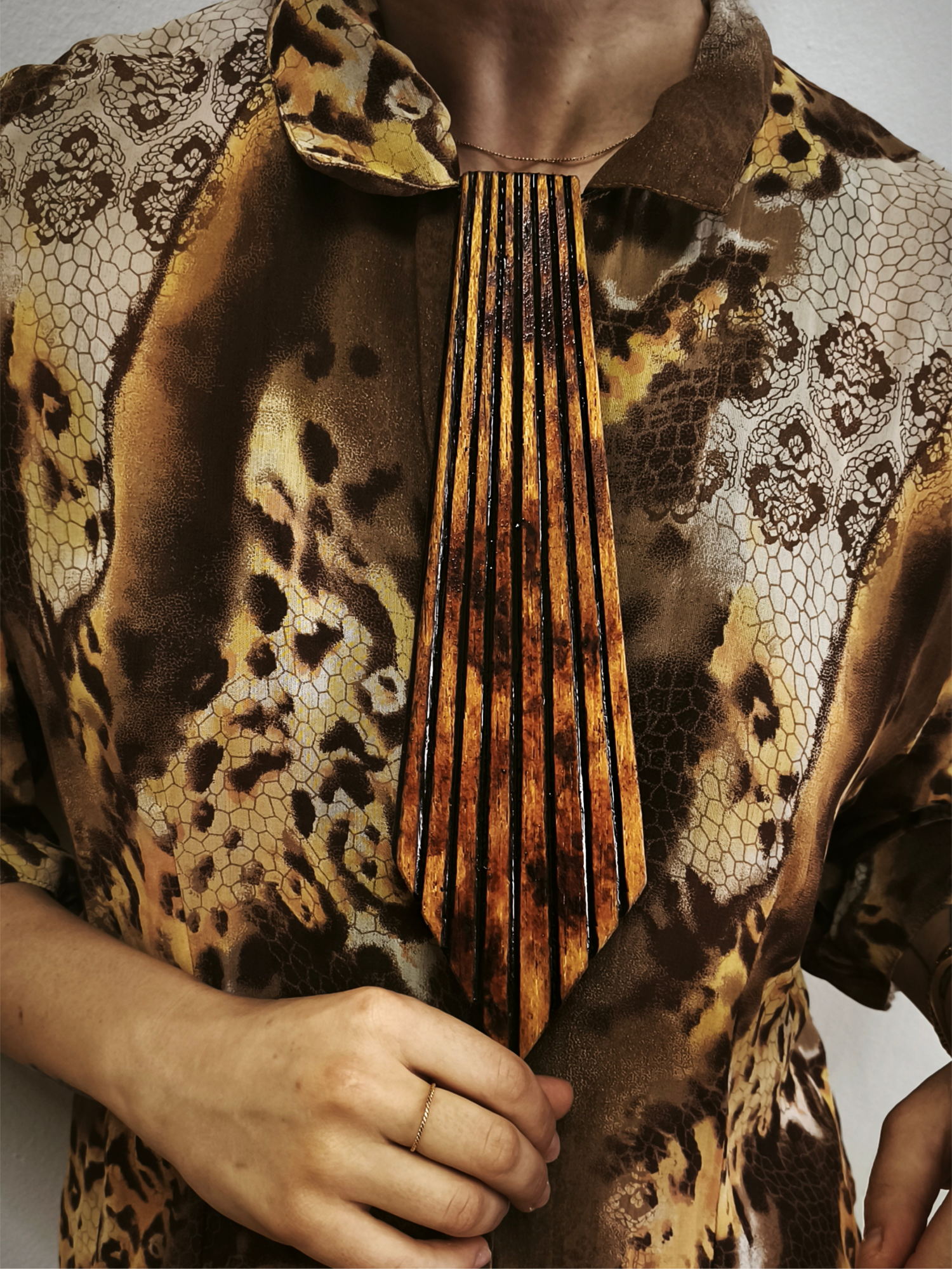 All wearable sculptures, including these one-of-a-kind ties, are handmade in our studio. They are created using building materials, objets trouvés, remnants from various projects, broken domestic items, things from other lives that no longer serve a purpose, and objects found in the streets or forgotten drawers. Each component is meticulously examined and manipulated in a way that highlights the material itself, aiming to find merit in the synthesis of elements, in what becomes a unique peculiarity in the form of a tie.